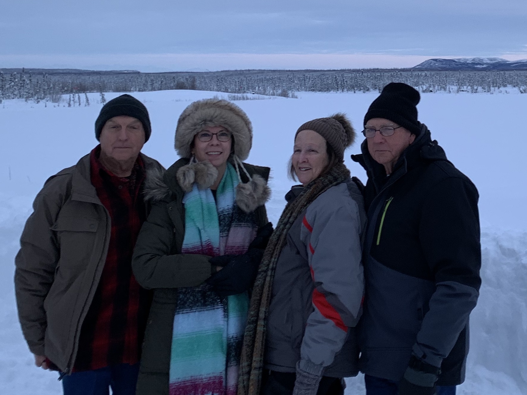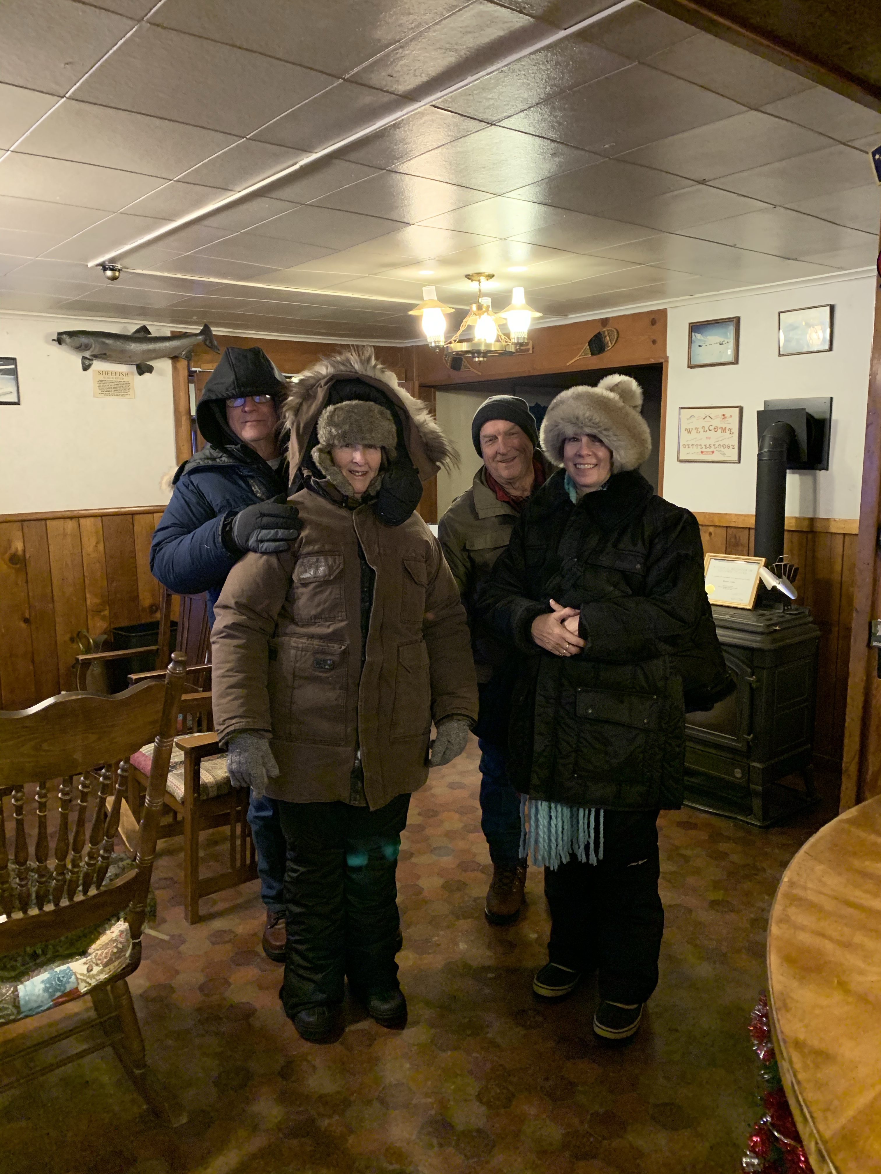 We have flown in a 10 passenger plane 40 miles past the Artic Circle to a town called Bettles. We had to stand on luggage scale and be weighted!!! It is the smallest city in the United States , boasting of their 12 full time residents. The lodge we stayed in is owned by the mayor( wife) and fire chief (husband). It is the quietest, whitest , most desolate place. It has Chef Ray who makes the best food I’ve ever put in my mouth, friendly staff ( Donna, Jason, Connie, and Ty). We ate and slept and waited for the Aurora Borealis Lights that never showed up during our two day stay. We drank hot chocolate, got to know staff and other guest ( Naji from Japan and Jarin and Sarah from Portland). We sat out under the stars in totally quiet. We changed in and out of boots, balaclavas, parkas and gloves over and over and over again. It went between -26 below to 10. There is only one way in or out during most of the year and that’s by plane. You share it with supplies and local Alaskans from small surrounding villages. We met Pastor Rich who is also the weather observer and head of their Republican Party. The guys rode snowmobiles with a guide because I tell you this, you can get lost in a second if you get off the 2 streets in town. It is solid Dry white snow with a snow mist ,and twilight kind of sky, with Brooks Mountain Range in the distance. The sun does come up but it’s so low on the horizon it puts out shallow angles of light. You would have to like quiet, 🥶and no need for a doctor. It take an hour by plane that only comes once a day to get you out of there which is also how you get any food or supplies which cost $1 a pound to bring. I believe it may be the remotest place to visit or live. They are a special bunch of folks!
