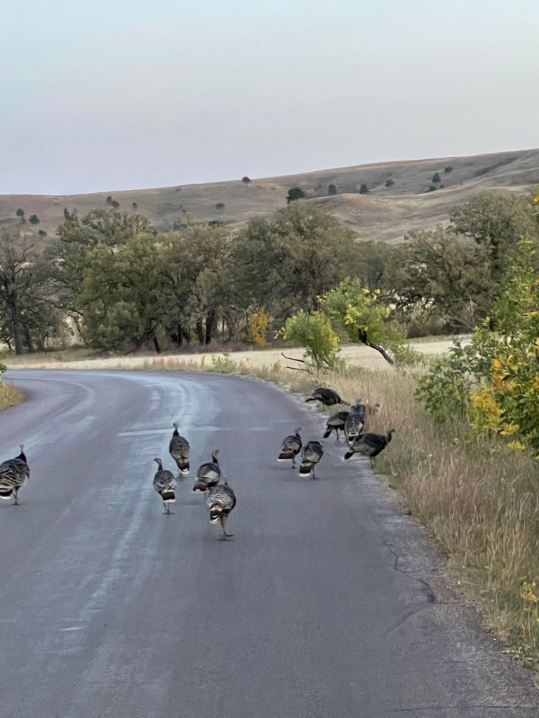 ✅ Another National ParkCold Brook Canyon Trail, 2.8 mile hike. Even at 78 degrees, you should do this early or late. Look at the stowaway that got hot and tired. Prairie Dog songMantis said “Pray!”Prairie Land, had to break out in 🎶 song. “ Home home on the range…Looking rough but feeling happy Barn Quilts 😍Fried Green Beans in Custer, SDHow many deer can you see?Turkeys everywhereMore turkeys“Turkey trot” across the road
