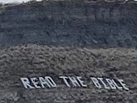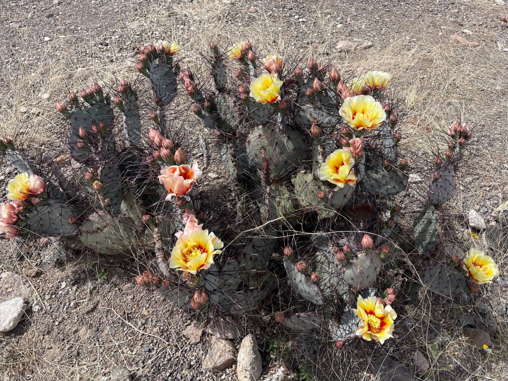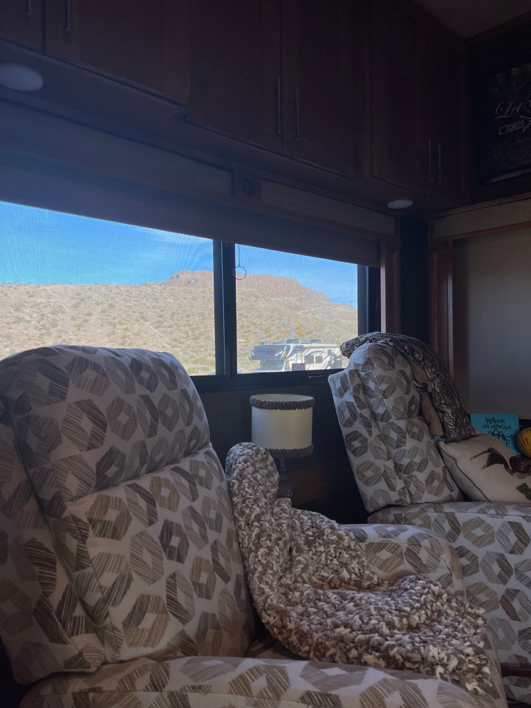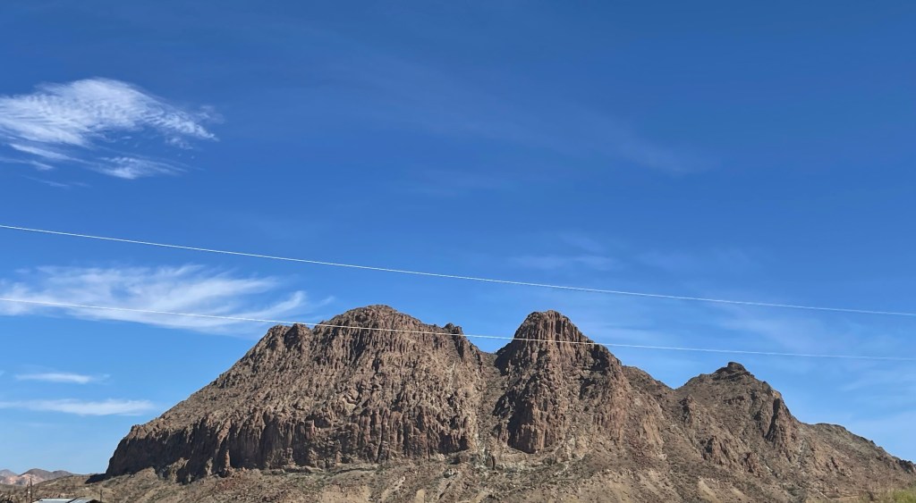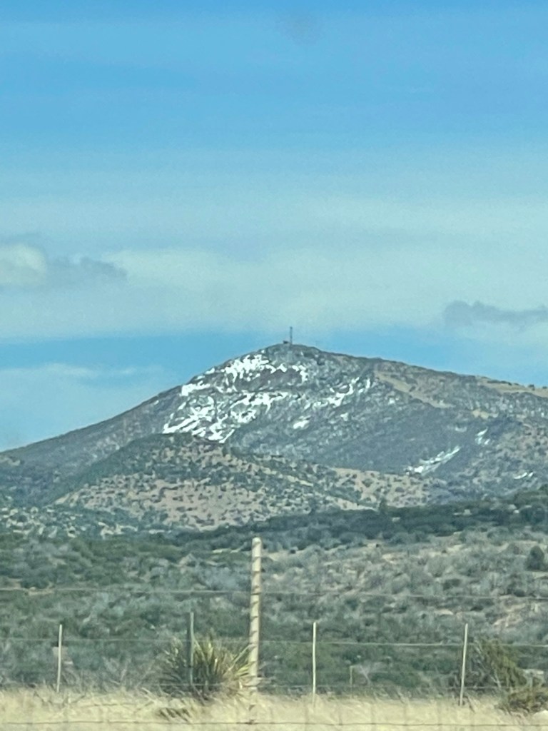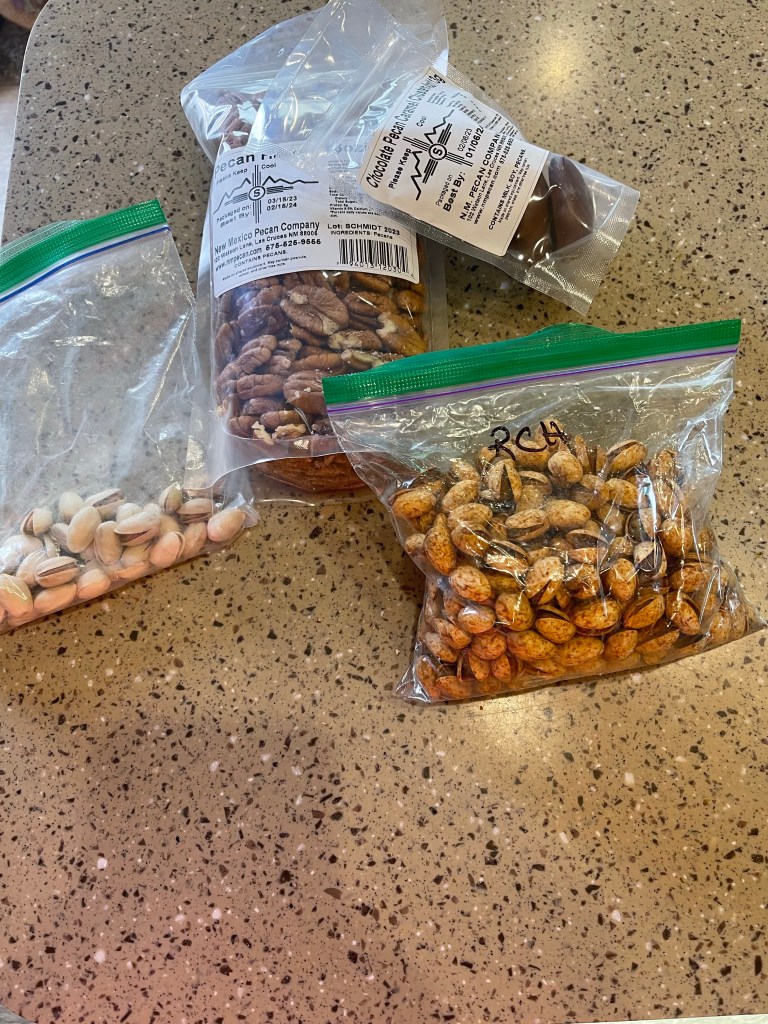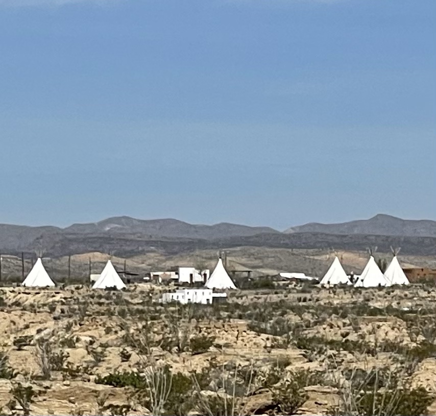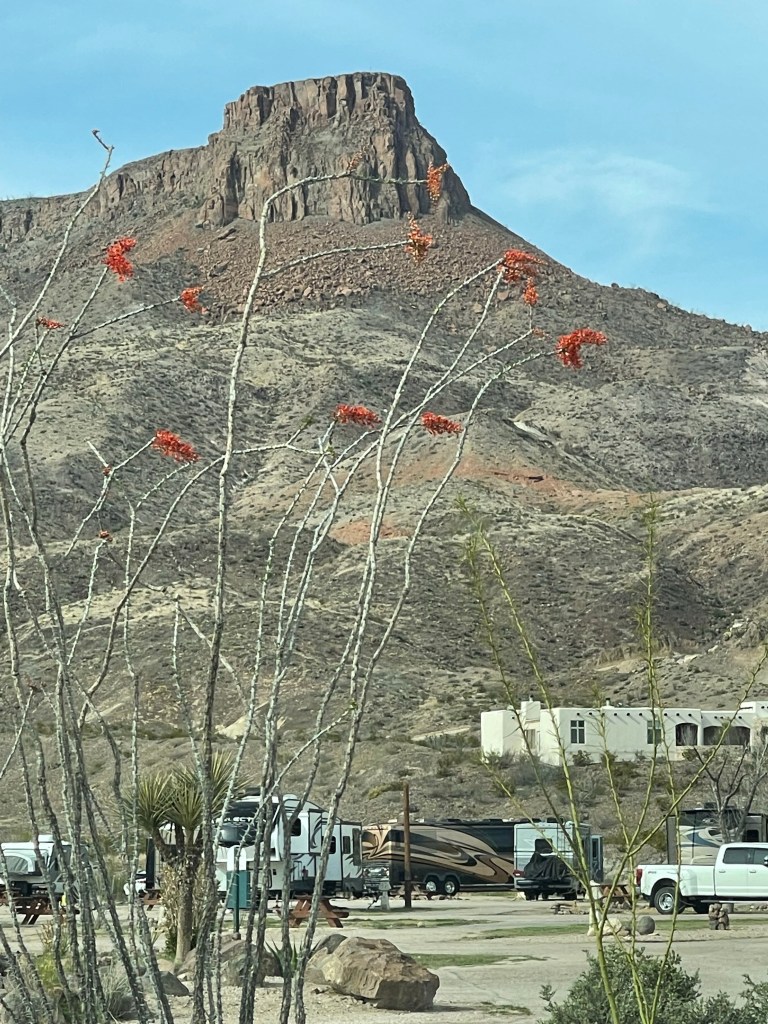 Somebody forgot to tell this mountain it’s spring now. Message on the side of a mountainIn Terlingua they have to cutest tipi, bubbles /domes and adobe cabins just a few miles away to rent if you don’t RV. Lajitas RV Nice view from back window. New Mexico has pecans and pistachios orchards galore ,so I’m eating them through the state.
