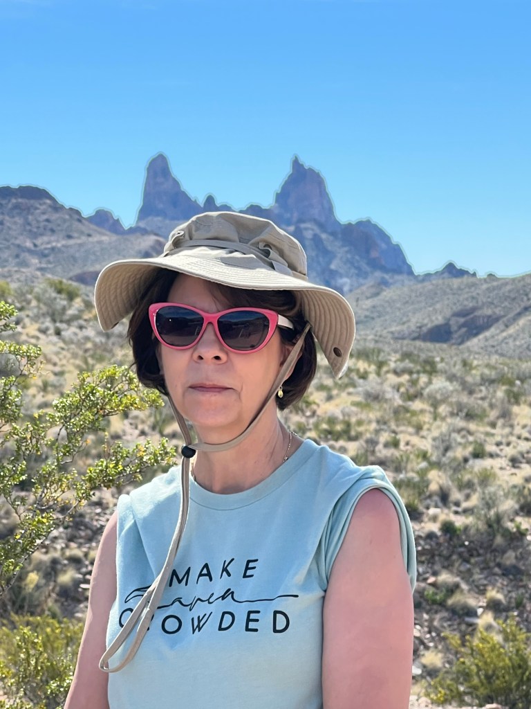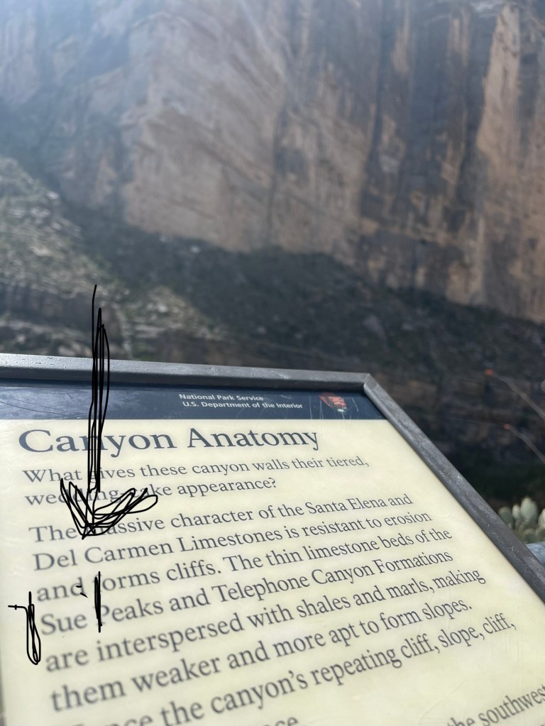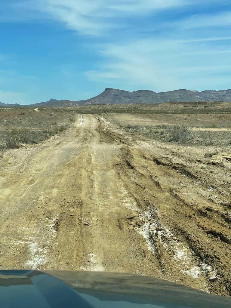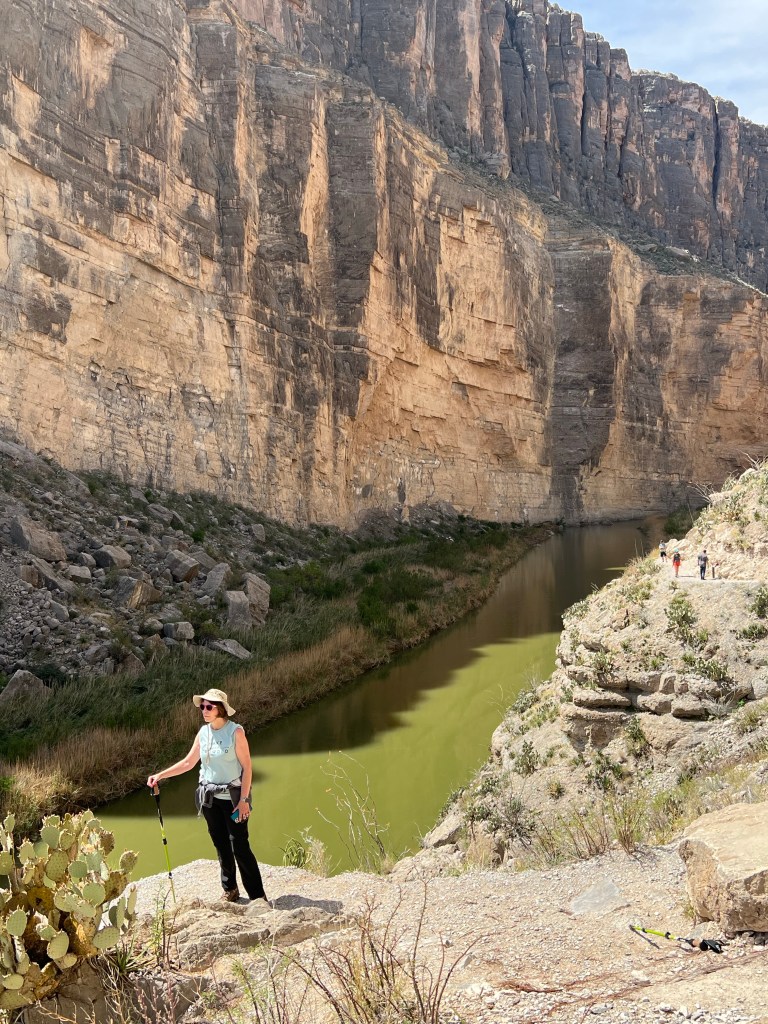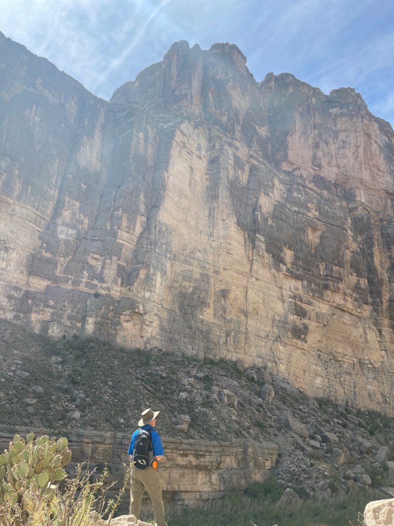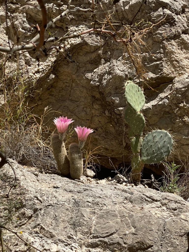This is inside Big Bend National ParkSeveral trails to old ranches. This one was my favorite. It was so secluded ( people reported they did suffer from isolation ). a spring kept the trees ( fig and pecan) alive. Not funny Gregg! Positioned me right between the “ Mules Ears” Mountains. You must walk across the Rio Grande to get to the Santa Elena Canyon trial and up an embankment. I’m not gonna lie, I had to have help. Yep you have to go 👆to the top and then around a small pathway. Growing on the side of the mountain. Sometimes I wish I could read his mind. Not for anyone with the fear of heights. A young man on his way down said” I was enthralled with the calm provided by the King” Finally something named Sue ( besides a boy named Sue) Oh we are not finished yet?Desert and left over flash flood mud.