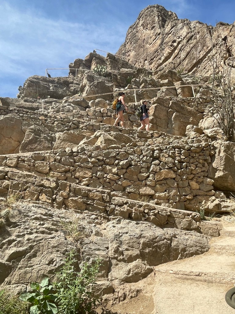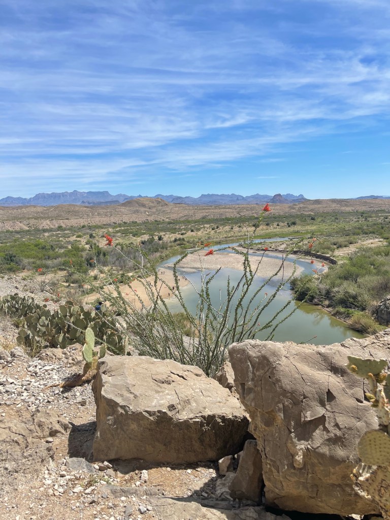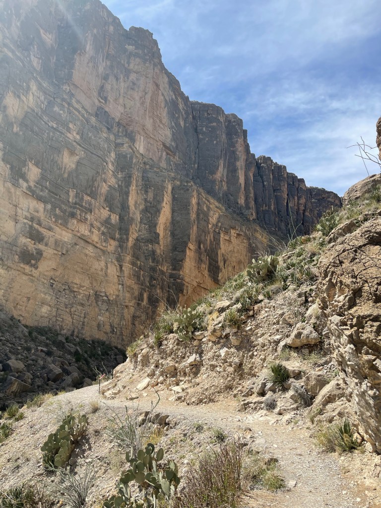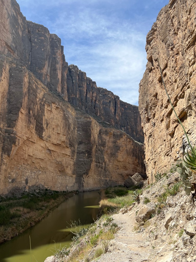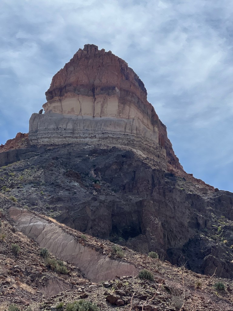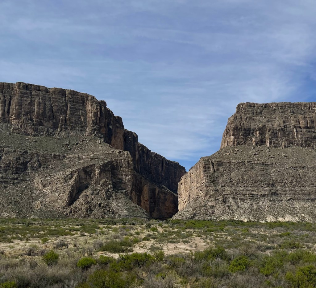 This is inside Big Bend National ParkSeveral trails to old ranches. This one was my favorite. It was so secluded ( people reported they did suffer from isolation ). a spring kept the trees ( fig and pecan) alive. Not funny Gregg! Positioned me right between the “ Mules Ears” Mountains. You must walk across the Rio Grande to get to the Santa Elena Canyon trial and up an embankment. I’m not gonna lie, I had to have help. Yep you have to go 👆to the top and then around a small pathway. Growing on the side of the mountain. Sometimes I wish I could read his mind. Not for anyone with the fear of heights. A young man on his way down said” I was enthralled with the calm provided by the King” Finally something named Sue ( besides a boy named Sue) Oh we are not finished yet?Desert and left over flash flood mud.
