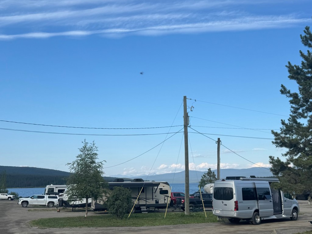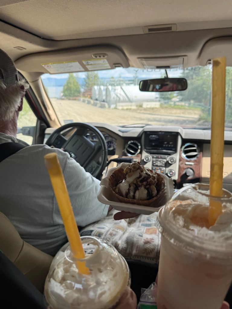 Arrived, did laundry, ice cream run to a food truck. Weather nice and clear but warm at 80°. Mosquitoes will literally take you down. Guys got fishing license and are planning to stop along the way tomorrow to try for some Artic Grayling.