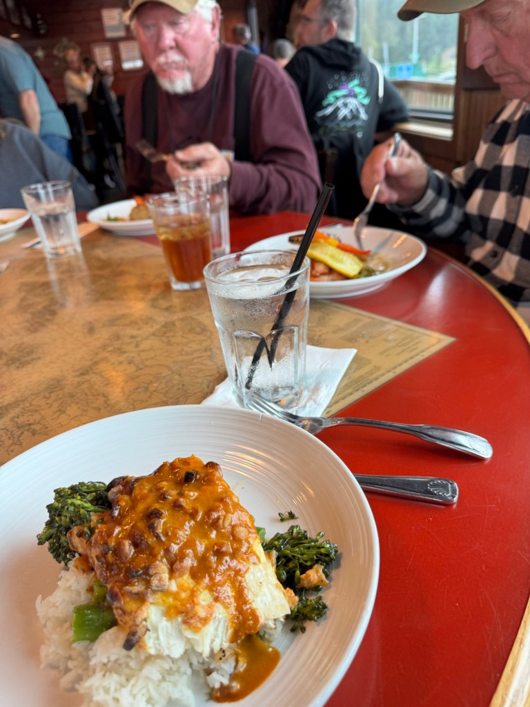 2. Brandy Glazed Wild Alaskan Salmon/Housemade brandy-brown sugar on oven roasted tender Salmon , garlic mashed potatoes and roasted vegetables.