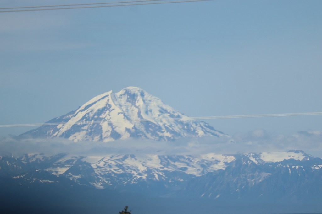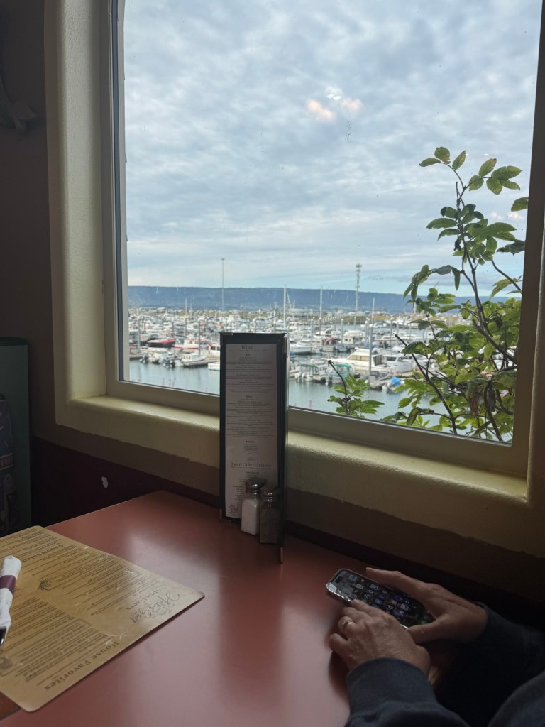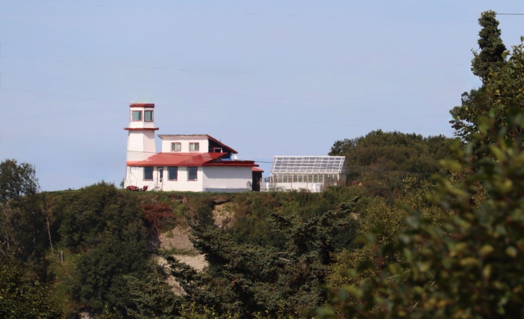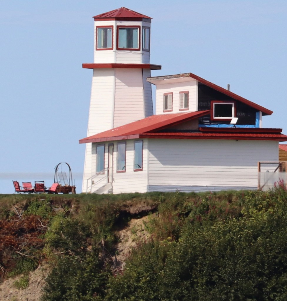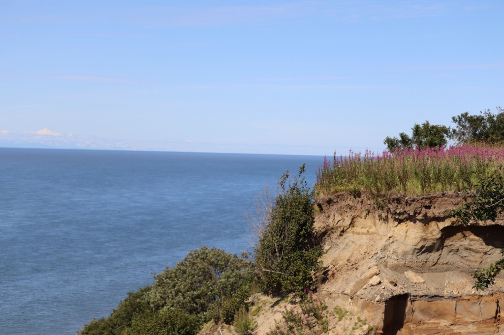 These fish cleaning tables are right in the water. Mt. Redoubt Kenai Mountains in the back ground.Homer LighthouseFireweed at the top of the cliff. Harbor GrillOur view for dinner.