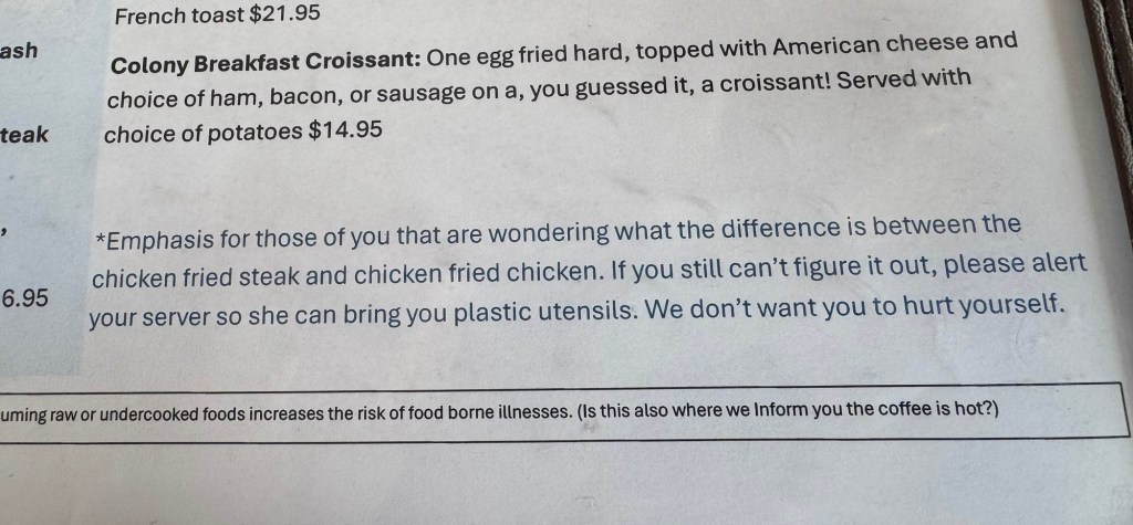 Palmer, Musk Ox Farm, Matanuska Glacier, overnight in Glen Allen, AK Funnies on the menu and signs all over the walls. This was the pizza place last night. Having the SERVING SPATULA and WATER PITCHER carried in this way disturbed me. World’s largest Musk Ox farm. Love the musk ox weathervane❤️ Share this: Click to share on Facebook (Opens in new window) Facebook Like Loading... Published by gillsrbornetotravel View all posts by gillsrbornetotravel