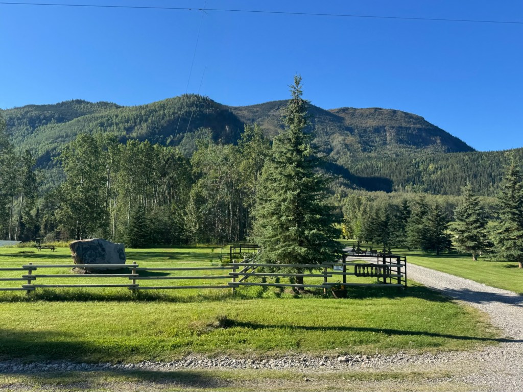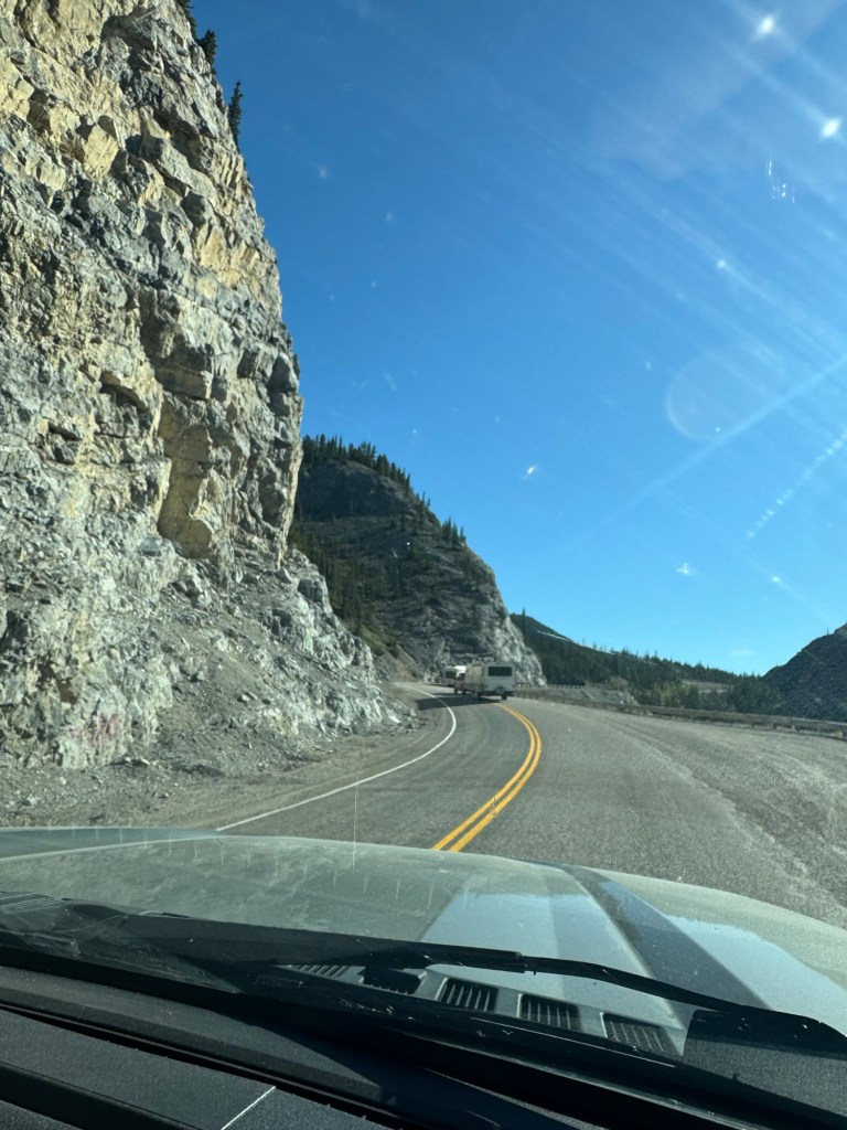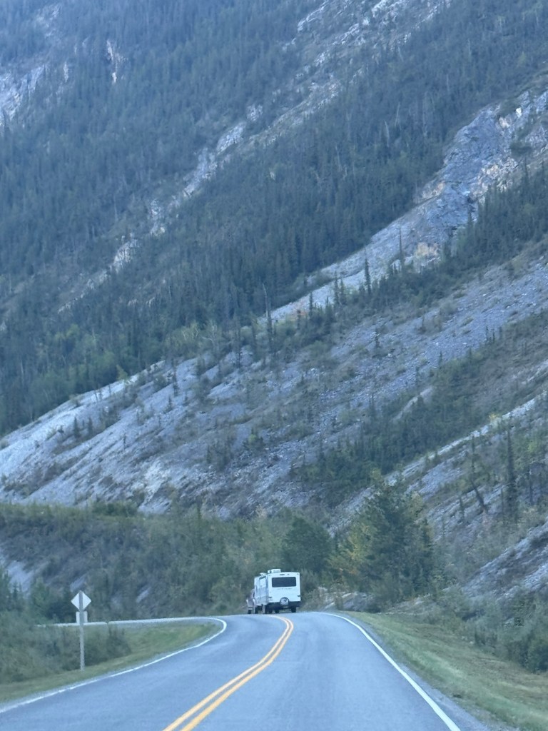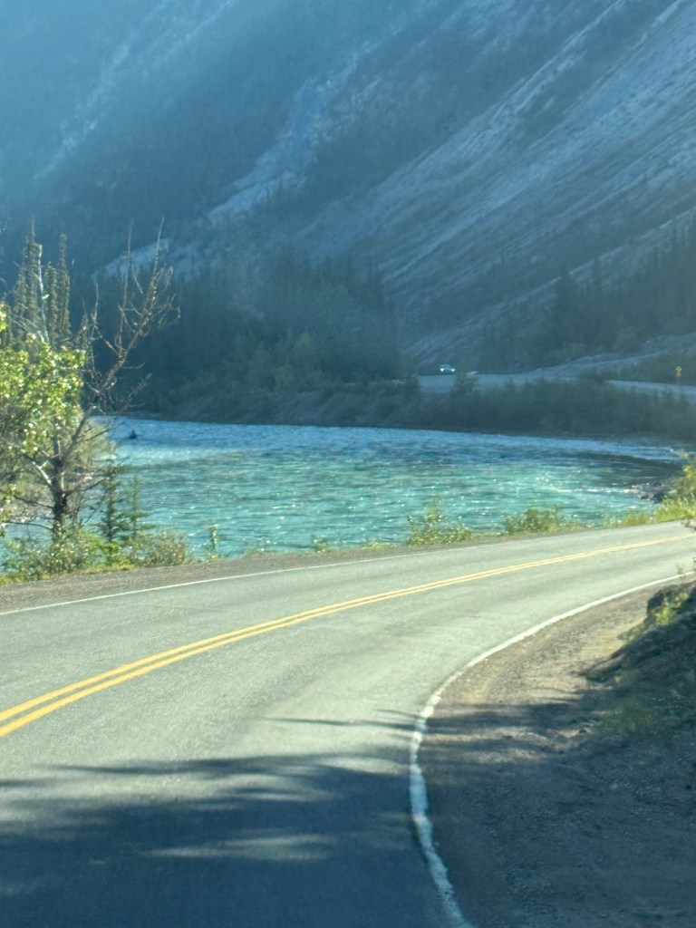 Unique swingYes, sat my chair in the water and enjoyed the cold (not cool) water. These trash and 911 phones dot the highway. We were right on Muncho Lake in 👆Yukon Northern Rockies Lodge & RV for 2 days. Stayed at Sikanni RV the next night and it was on the river. It’s redeeming quality was it had my favorite Maple Walnut ( we call it black walnut) ice cream.Reflection and shades of blue at Muncho Saw bears too but too quick for pictures. Curves on highway next to beautiful blue water. See how tiny we look 👀 to the right. Pretty farms in the valleysStacked hay balesListening to LSU game on radio!!!!