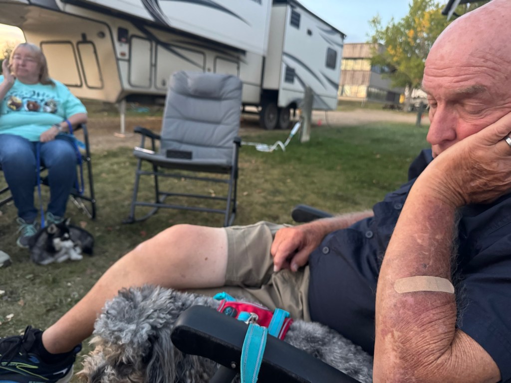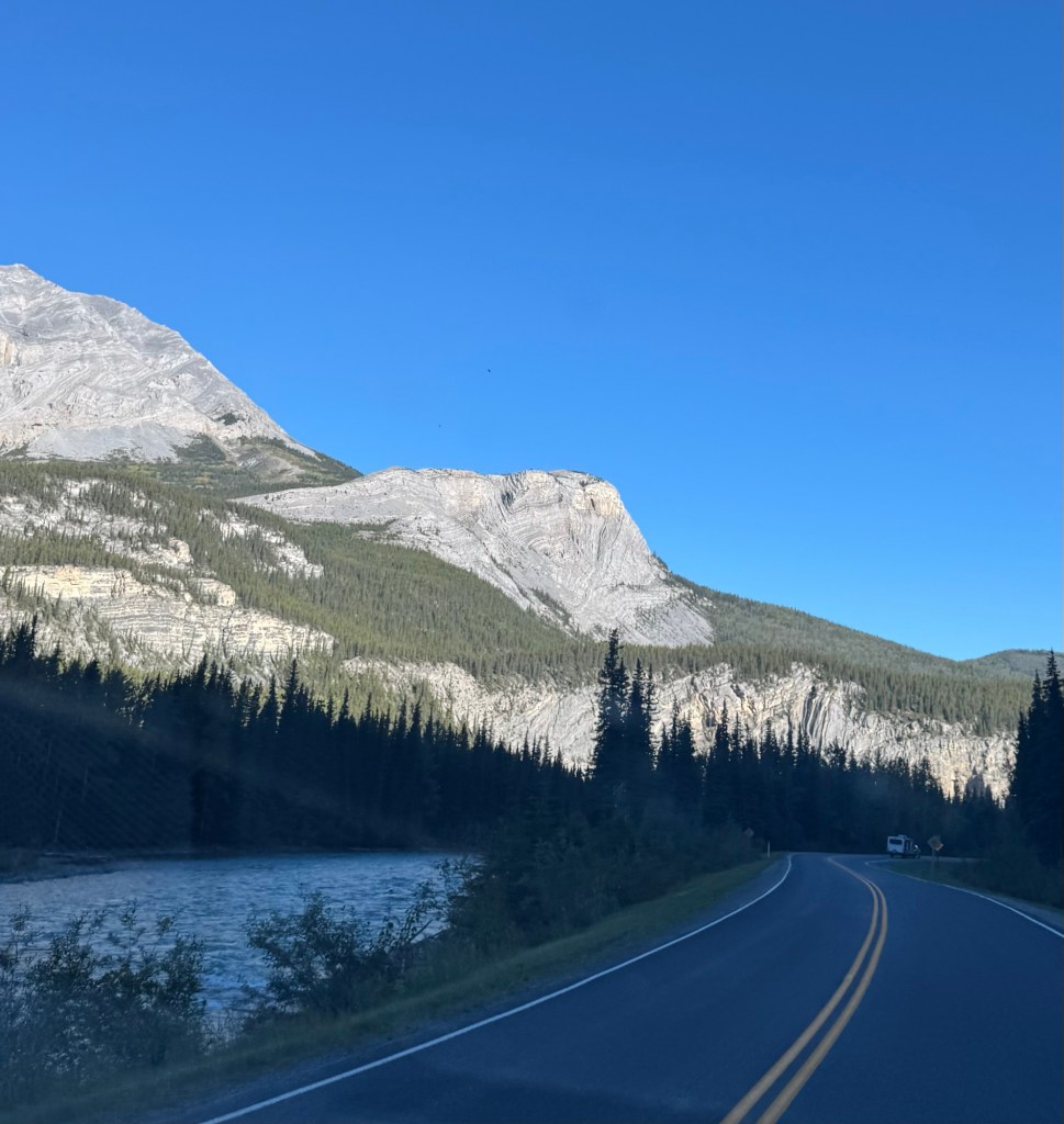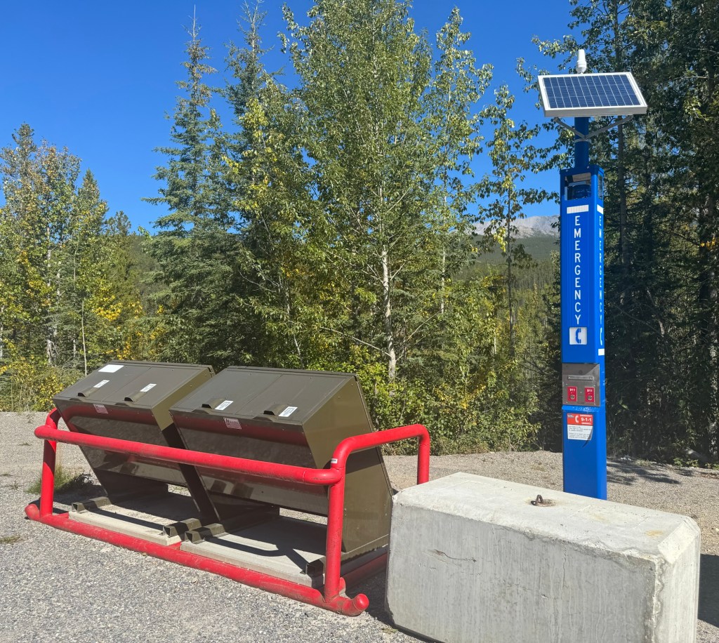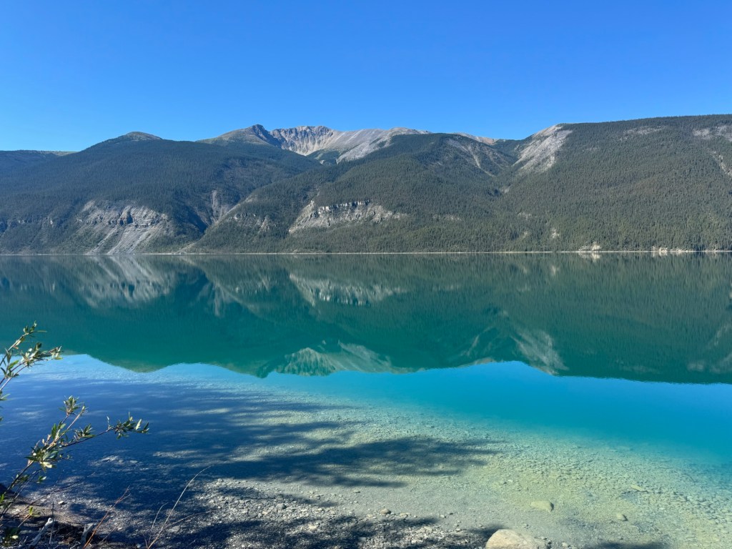 Unique swingYes, sat my chair in the water and enjoyed the cold (not cool) water. These trash and 911 phones dot the highway. We were right on Muncho Lake in 👆Yukon Northern Rockies Lodge & RV for 2 days. Stayed at Sikanni RV the next night and it was on the river. It’s redeeming quality was it had my favorite Maple Walnut ( we call it black walnut) ice cream.Reflection and shades of blue at Muncho Saw bears too but too quick for pictures. Curves on highway next to beautiful blue water. See how tiny we look 👀 to the right. Pretty farms in the valleysStacked hay balesListening to LSU game on radio!!!!